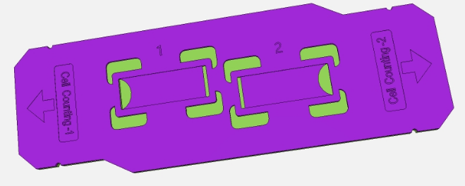 適配伯樂(Bio-rad)細胞計數(shù)儀使用。該細胞計數(shù)板采用微流控芯片技術(shù)制造,由一個表面具有兩個封閉室和帶有兩個進樣口的芯片組成。使用BIOFOUNT的細胞計數(shù)板,有污染風險較小和免去載玻片組裝的特點。一次性細胞計數(shù)板的優(yōu)點是無需蓋玻片和進行后續(xù)清潔工作。