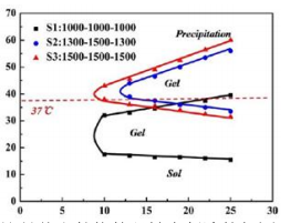 形成凝膠的過程是可逆的,溫度降低時可發(fā)生凝膠-溶液的轉(zhuǎn)變。在相變溫度以上,隨著溫度進一步升高凝膠逐漸發(fā)白變硬,再進一步升高溫度發(fā)生相分離,聚合物和水分離。